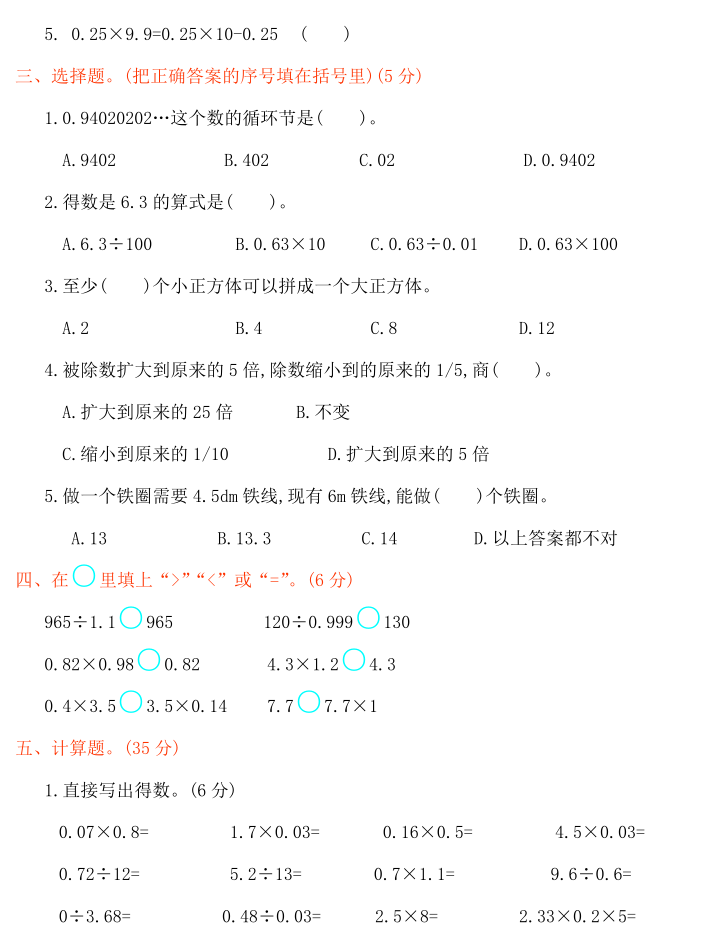 奧數 > 小學試題庫 > 期中試題 > 期中數學 > 五年級數學期中上冊 > 正文