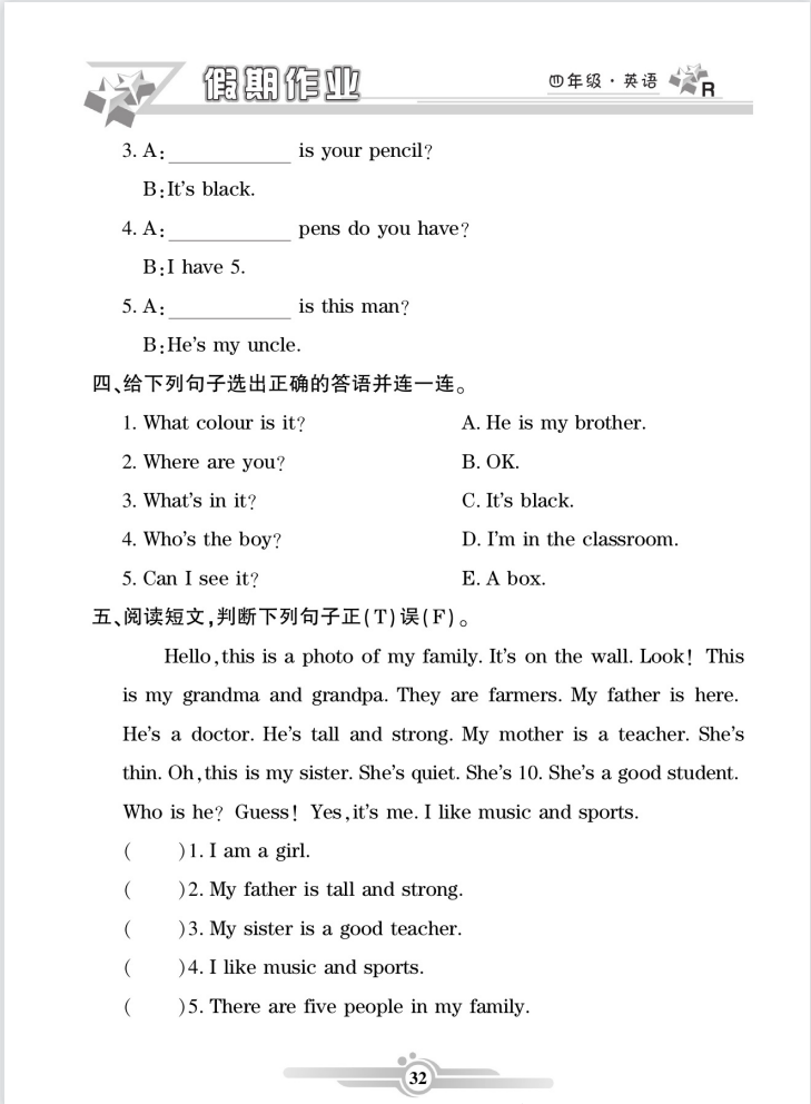人教PEP版小學四年級寒假假期天天練:作業十六(試題)(2)