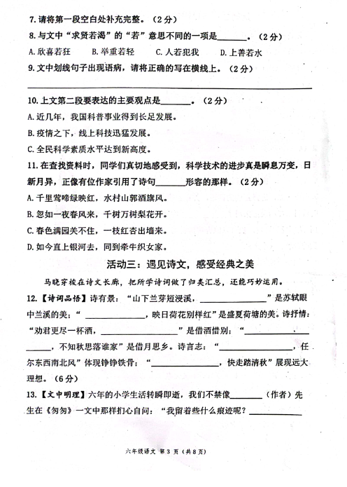 2023山東濰坊坊子區六年級下冊語文期末試卷(圖片版)(3)