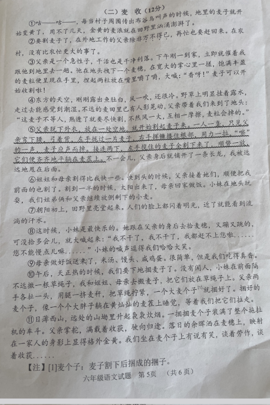 2023山東菏澤鄄城縣六年級下冊語文期末試卷(圖片版)(5)